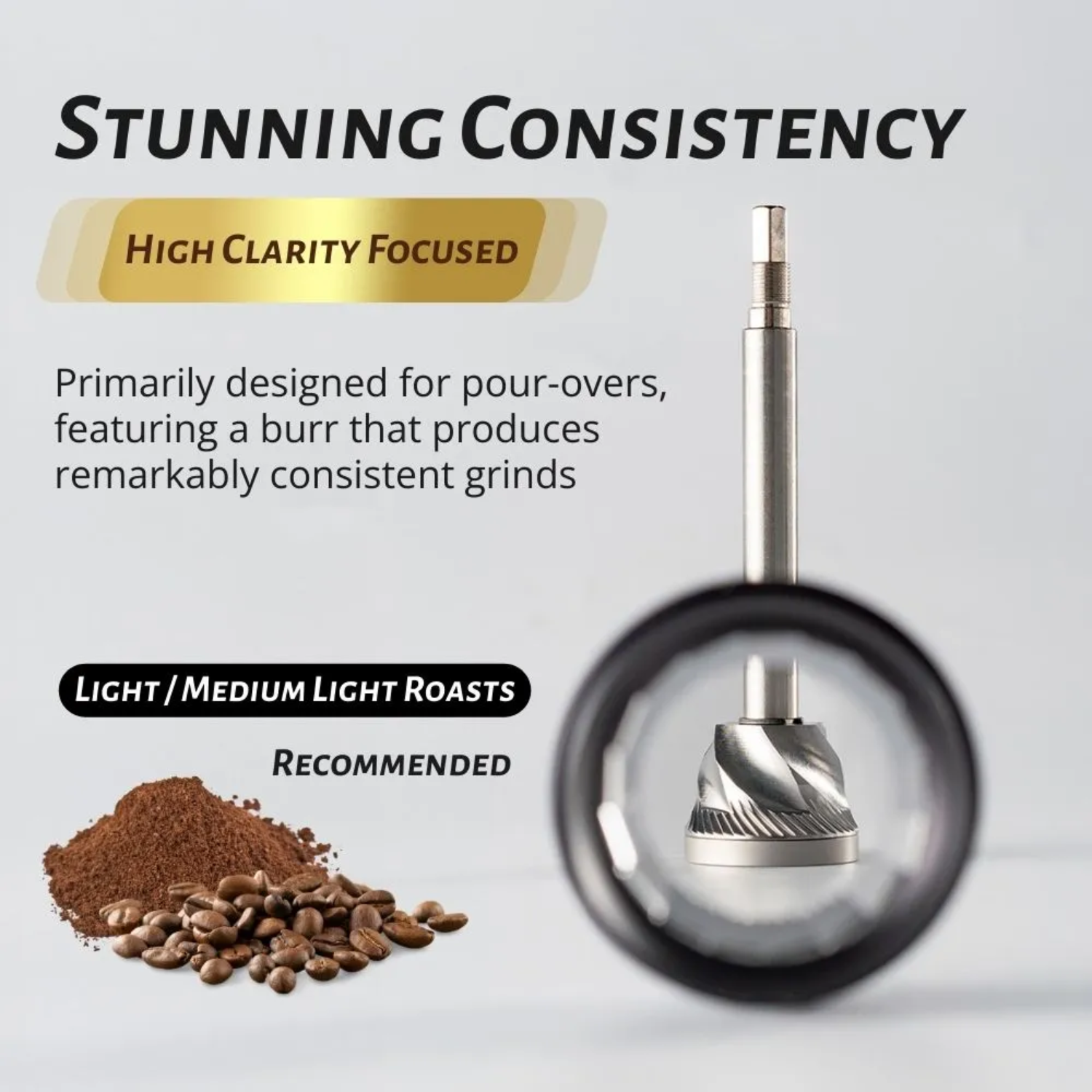 Features: Featuring a 48mm hexagonal stainless steel burr, the ZP6 ensures uniform particle size and efficient grinding. Its external adjustment mechanism offers 90 clicks per full rotation, with each click adjusting the grind size by approximately 22 microns. This allows for precise control over grind size, accommodating a range from 340 to 1400 microns. Additional features include a magnetic catch cup for easy grounds collection and a durable build combining wood, polycarbonate, silicone, stainless steel, and aluminum alloy.
