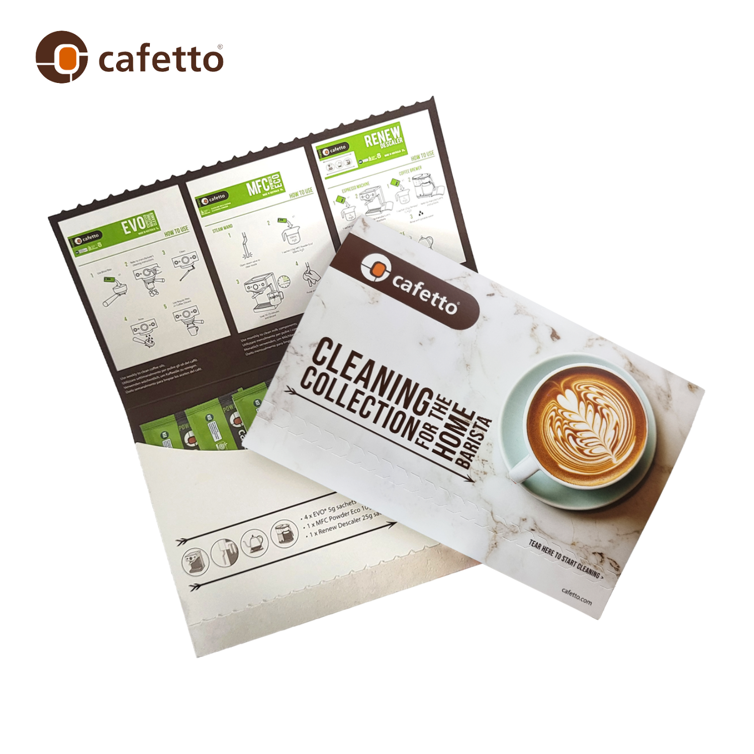 Specifications: To use the Cafetto Cleaning Collection, dissolve one sachet of EVO Cleaner in water weekly and run a cleaning cycle to remove coffee residues. Monthly, use one sachet of MFC Powder Eco to clean milk systems and one sachet of Renew Descaler to remove scale build-up. Regular use keeps your espresso machine clean, efficient, and delivering consistently great-tasting coffee.