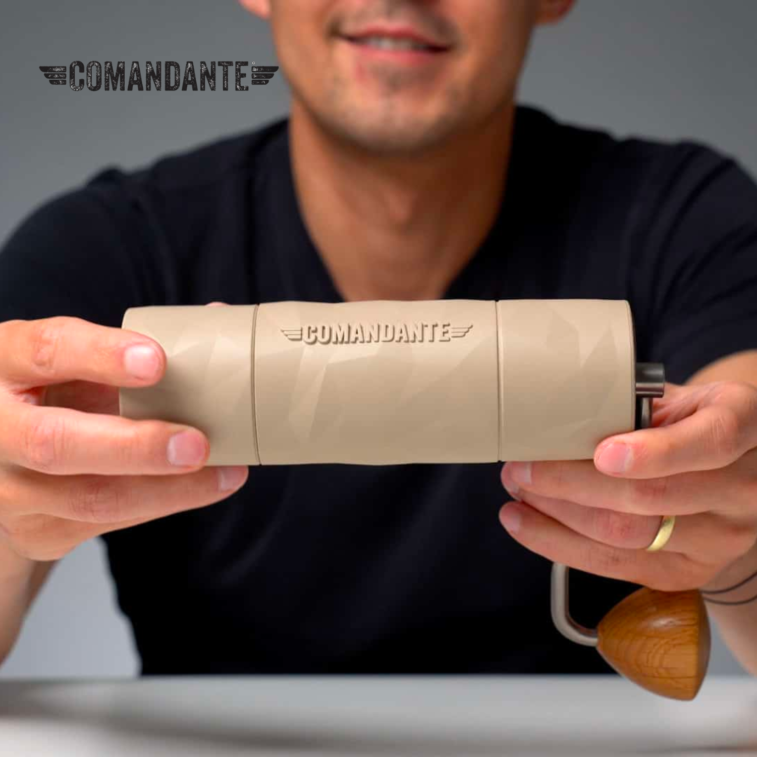 The Comandante X25 Trailmaster Dune is a robust, lightweight manual coffee grinder engineered for adventure. Crafted in Germany, it combines durability with precision, making it an ideal companion for coffee enthusiasts who enjoy brewing on the go. Its polygonal body, molded from QTP®—a high-performance techno-polymer—ensures resilience against the elements while maintaining a sleek, ergonomic design.