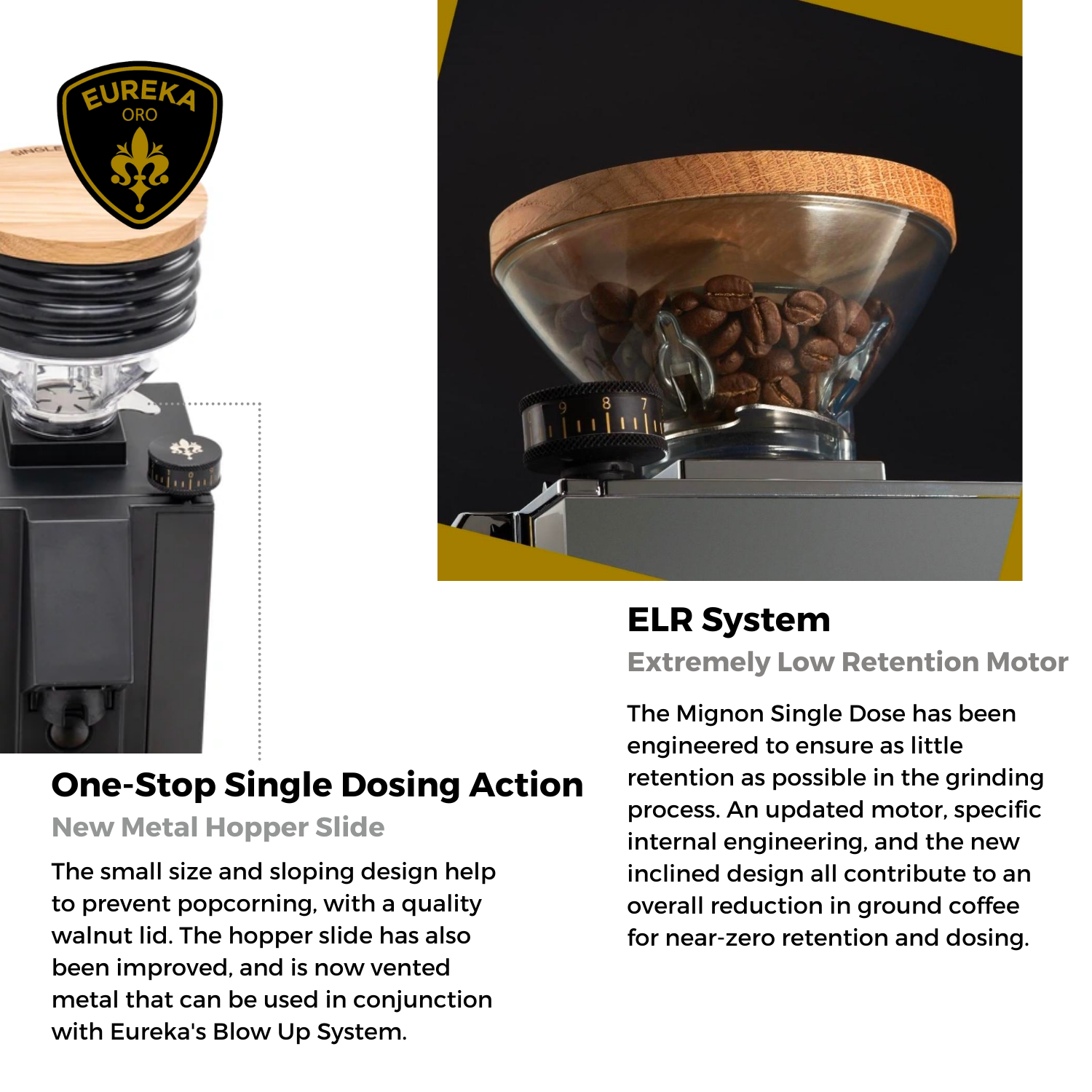 The Eureka Mignon Oro Single Dose grinder is purpose-built for home baristas who value precision, consistency, and extremely low retention. Its distinctive 15° inclined design sets it apart, helping users achieve near-zero grind retention—perfect for those who single dose and carefully weigh each shot. Designed for espresso lovers and coffee ritualists, this grinder delivers both performance and thoughtful detail in every use.