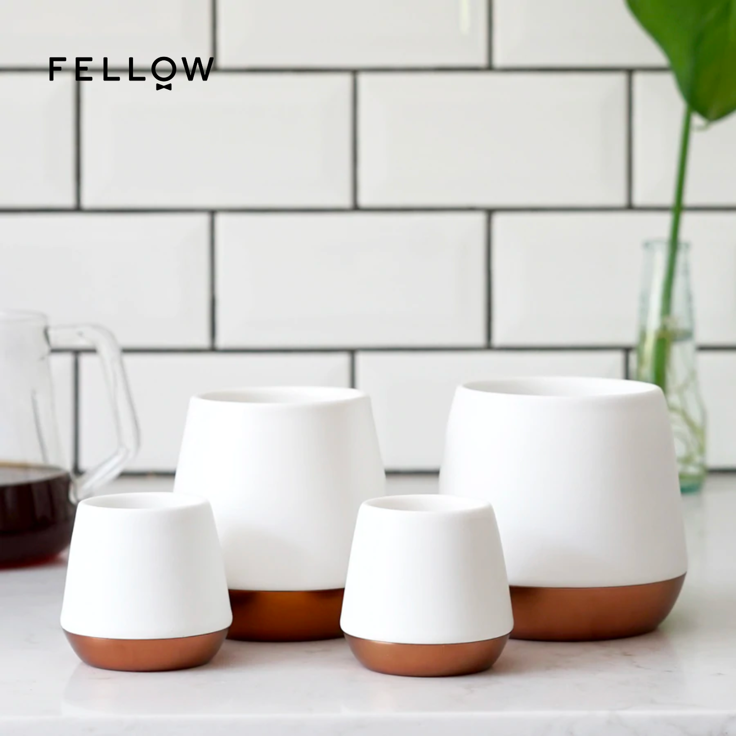 The Fellow Joey Double Wall Ceramic Mug is a sophisticated piece of drinkware designed to enhance your coffee or tea experience. Combining a matte ceramic body with a polished copper-coated stainless steel bottom, this mug exudes elegance and modernity. Its handleless, tapered design offers a comfortable grip, making it a stylish addition to any kitchen or office setting.