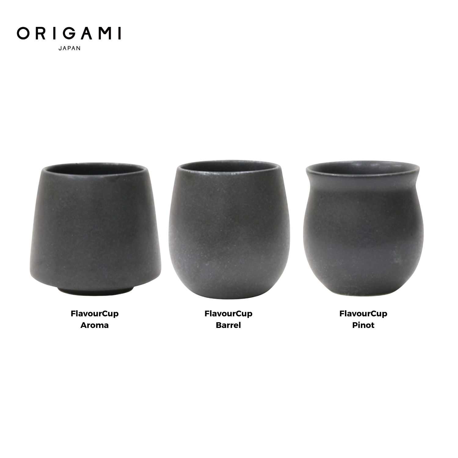 Features: The Origami Flavour Cup series comprises three distinct designs—Aroma, Barrel, and Pinot—each available in black and white. The Aroma cup accentuates bright acidity and fruity notes, the Barrel cup emphasizes sweetness and roundness, and the Pinot cup offers a balanced profile with enhanced floral aromas. Each cup holds approximately 200ml and is crafted from traditional Mino ware porcelain, known for its durability and aesthetic appeal.