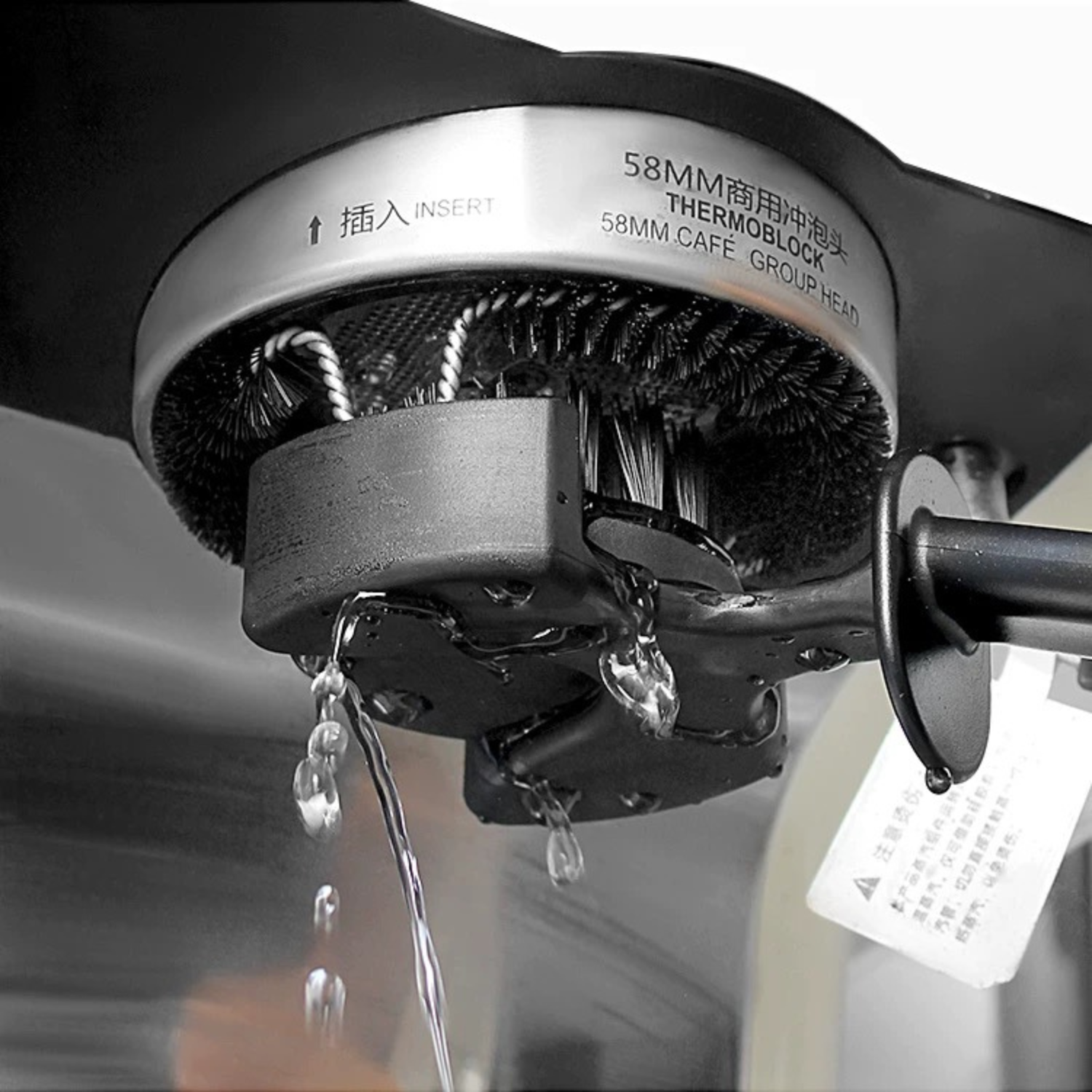 A dual-action scrubber brush with interchangeable firm and soft bristles for backflushing espresso machine groupheads and maintaining portafilter grooves. Ergonomic handle ensures control during cleaning.
